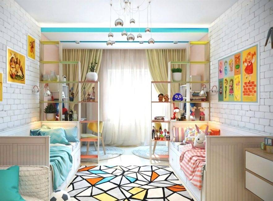 Если комнату делит мальчик и девочка, можно пространство делить перегородкой и каждую половинку оформлять по-своему, но с одинаковым набором мебели. Когда пространство маленькое, разграничение пространства производится цветом.