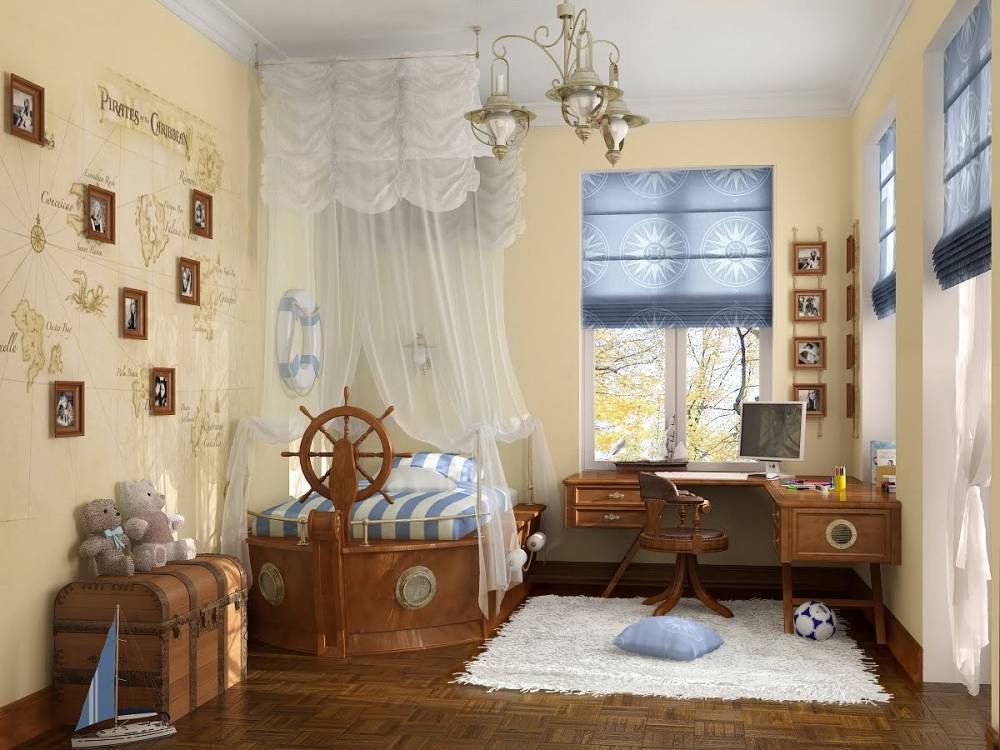 Мальчики любого возраста очень любят тематическое оформление комнаты. Если это малыши, стилизуйте комнату под сказочный лес — обоями, материалами, мелкими деталями. Если это детки школьного возраста, можно использовать морскую тематику, космоса, путешествий. Или любимых героев: трансформеров, супергероев, мстителей. Хорошо будет расставить акценты в виде тематических предметов: макетов кораблей, телескопа, стилизованного глобуса.