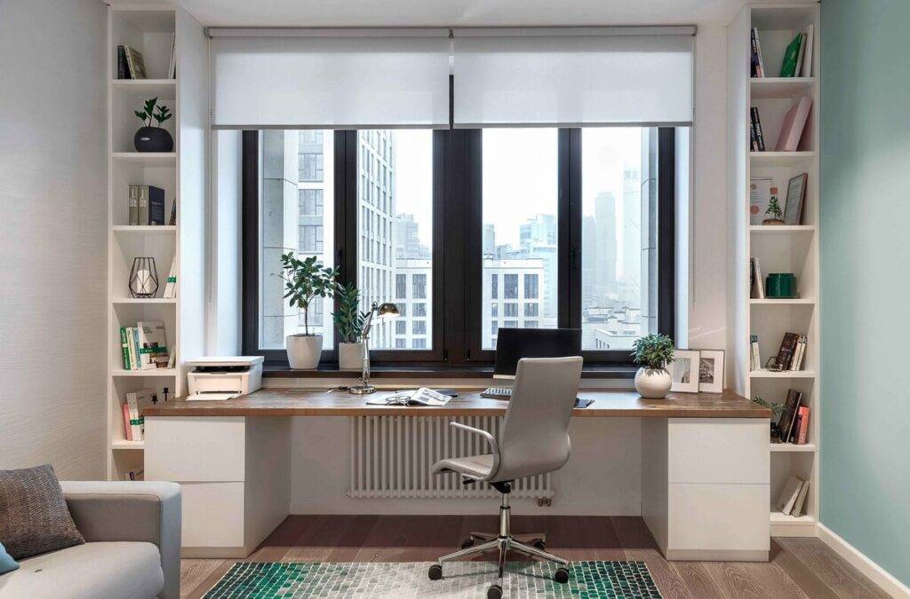 Расположение письменного стола на расстоянии 50 — 70 см позволит пользоваться более мягким рассеянным светом.