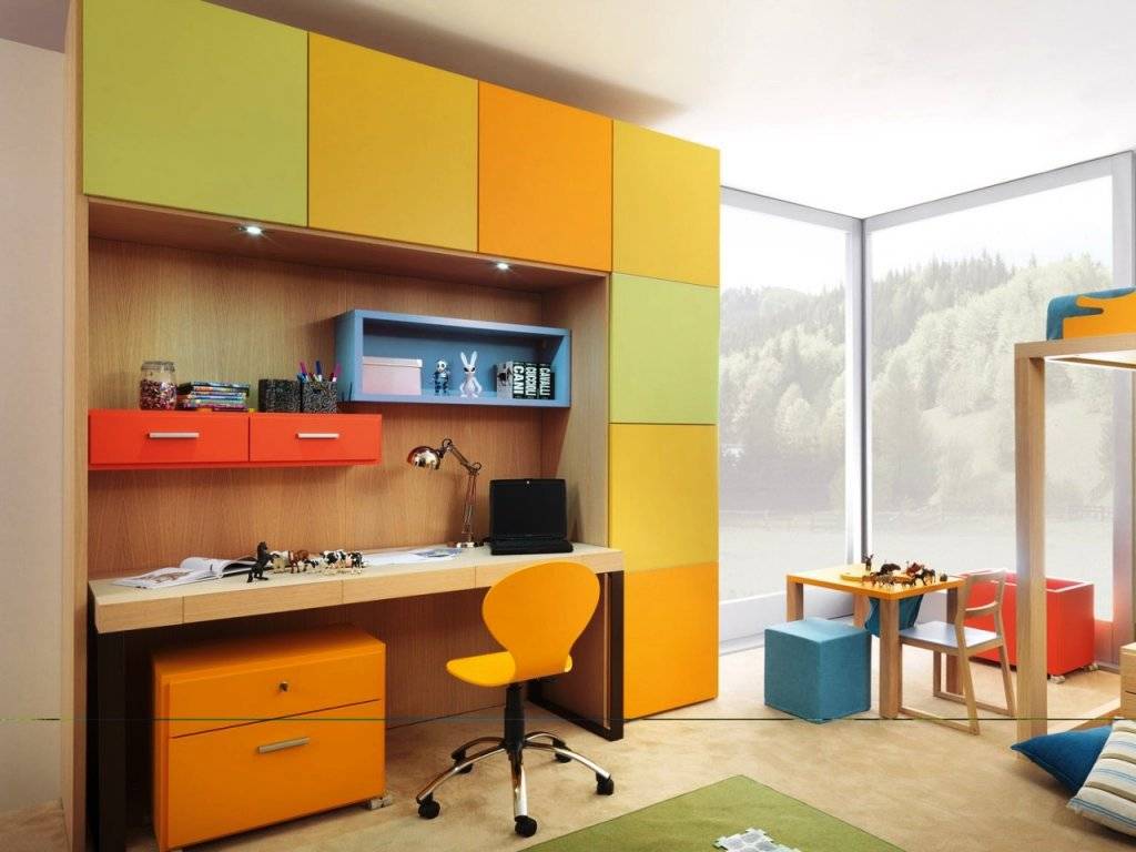 Чтобы небольшое пространство не давило на психику школьника, выбирают яркую и интересной формы мебель.