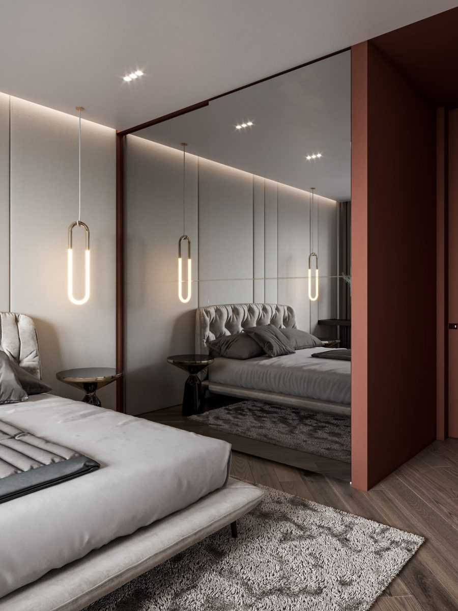 Нередко для увеличения площади спальни проводят перепланировку и выделяют дополнительные квадратные метры из соседних помещений. Если комната вытянутая, то вдоль ее поделить не получится. А при разделении поперек, одна половина останется без дневного света (без окна). Тогда встанет вопрос дополнительного освещения.