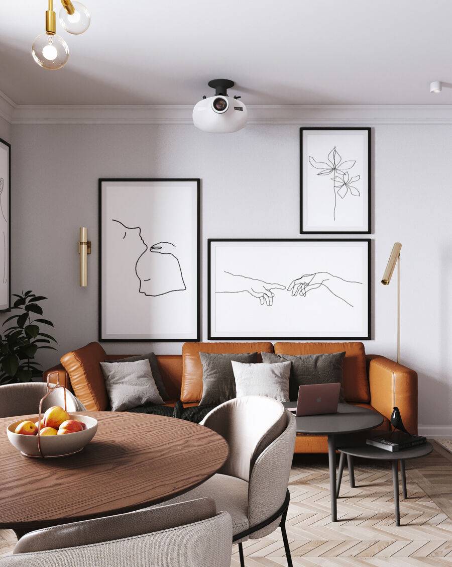 В угол гостиной комнаты идеально впишется напольная ваза, на стене можно повесить несколько маленьких картин или одно большое полотно.