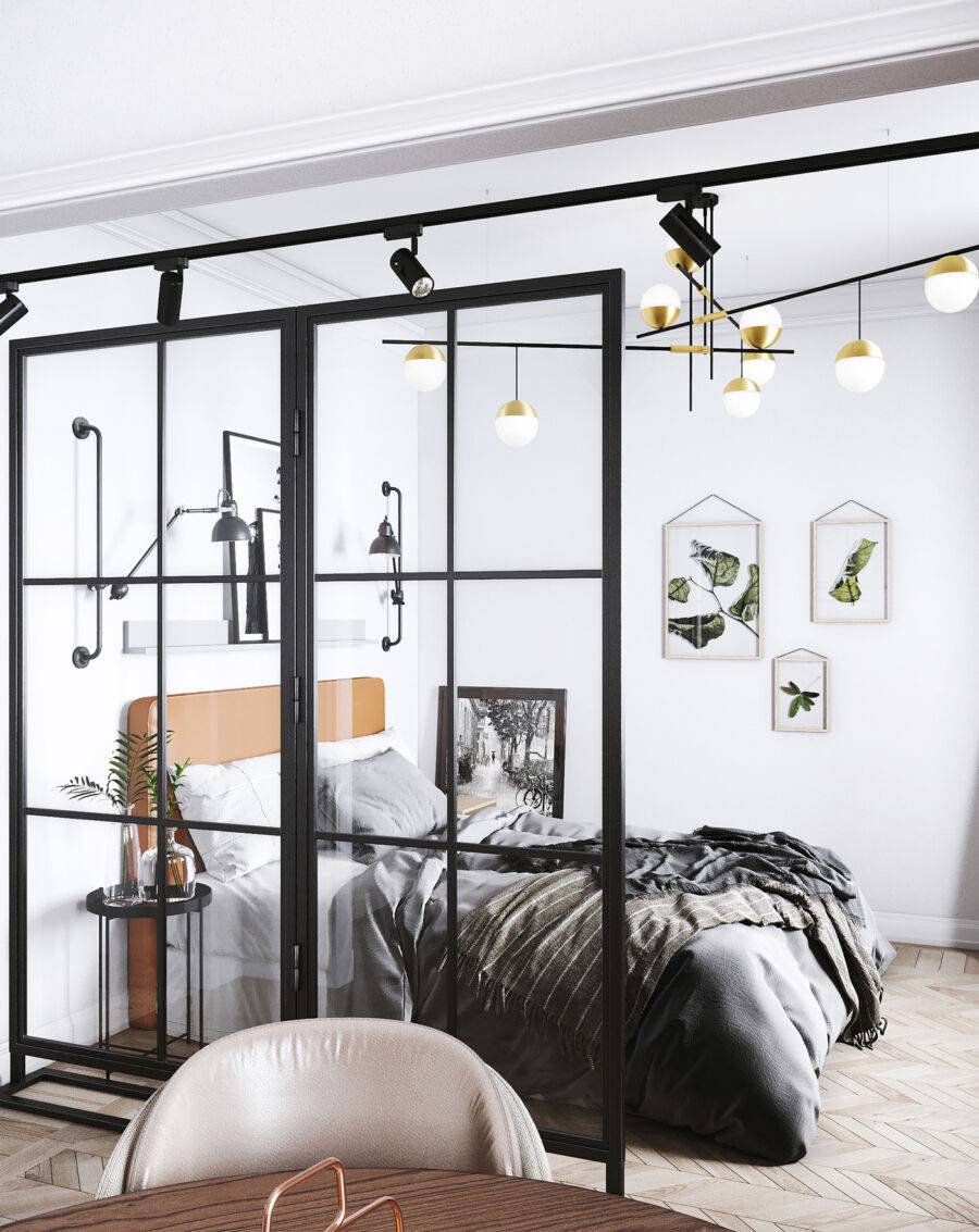 Место с кроватью лучше расположить подальше от дверного проема и отделить данный сегмент ширмой, занавесками, стеллажом или гипсокартонной перегородкой. Еще одним удачным вариантом зонирования станет применение разного напольного покрытия или возведение подиума. Максимально изолировать спальное место поможет установка раздвижных систем.