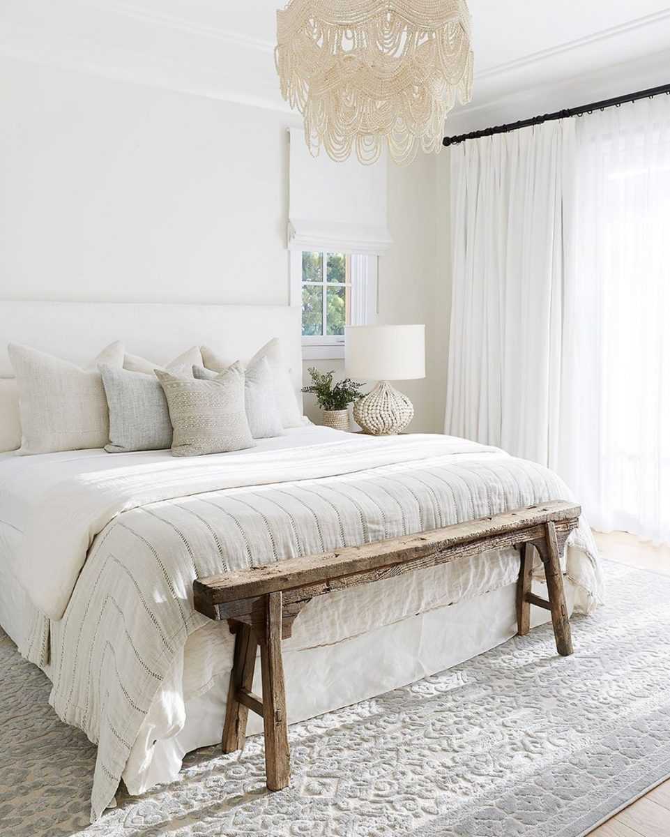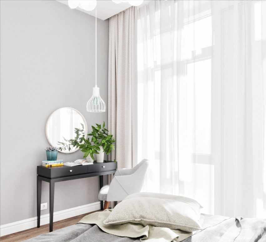 Повесьте полупрозрачные легкие шторы на всю стену с окном – это придаст помещению глубину и визуально поднимет потолок.