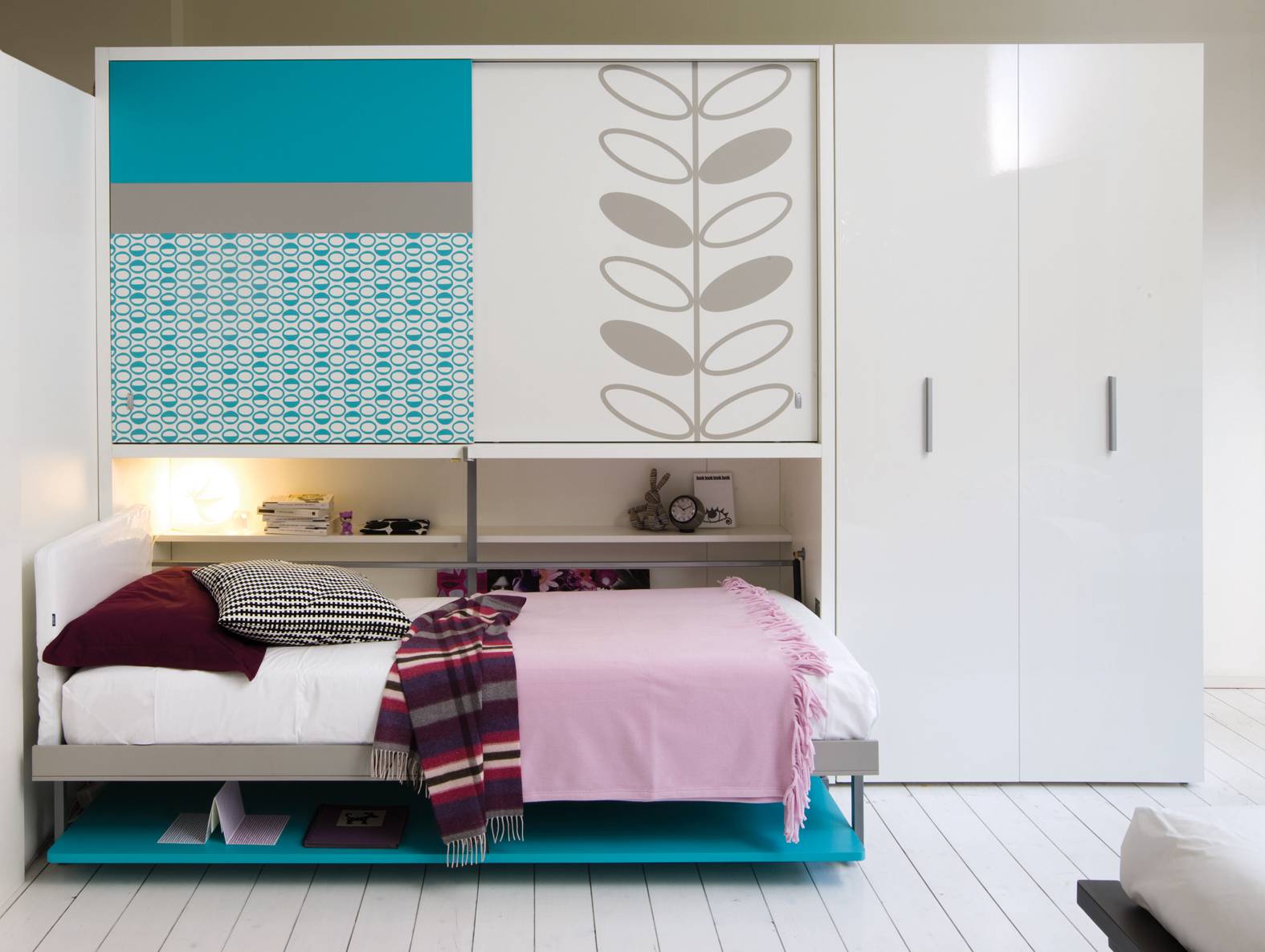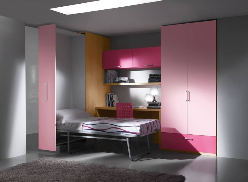 | Откидная кровать, поднимаемая в шкаф. Для детской комнаты станет оптимальным вариантом, если помещение имеет совсем небольшую площадь. Сложение спального места производится по его длинной стороне. По такому принципу могут складываться только детские или односпальные кровати. В качестве подъемных механизмов в данной модели применены газовые лифты. | |
