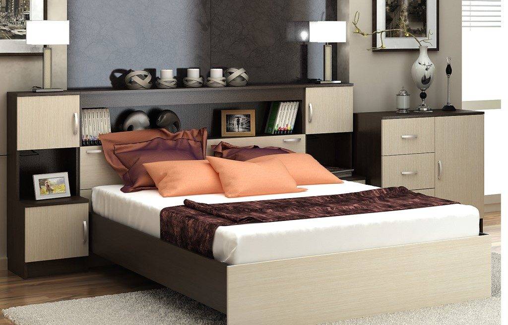 Мебель такого типа напоминает конструктор, который каждый желающий соберет самостоятельно. Идущие в комплекте блоки переставлять местами, убирать или по-разному комбинировать между собой. Кровать может иметь традиционный вид, выполняться из дерева или металла. За изголовьем будут установлены модули-шкафчики, которые реально трансформировать в прикроватные тумбы.