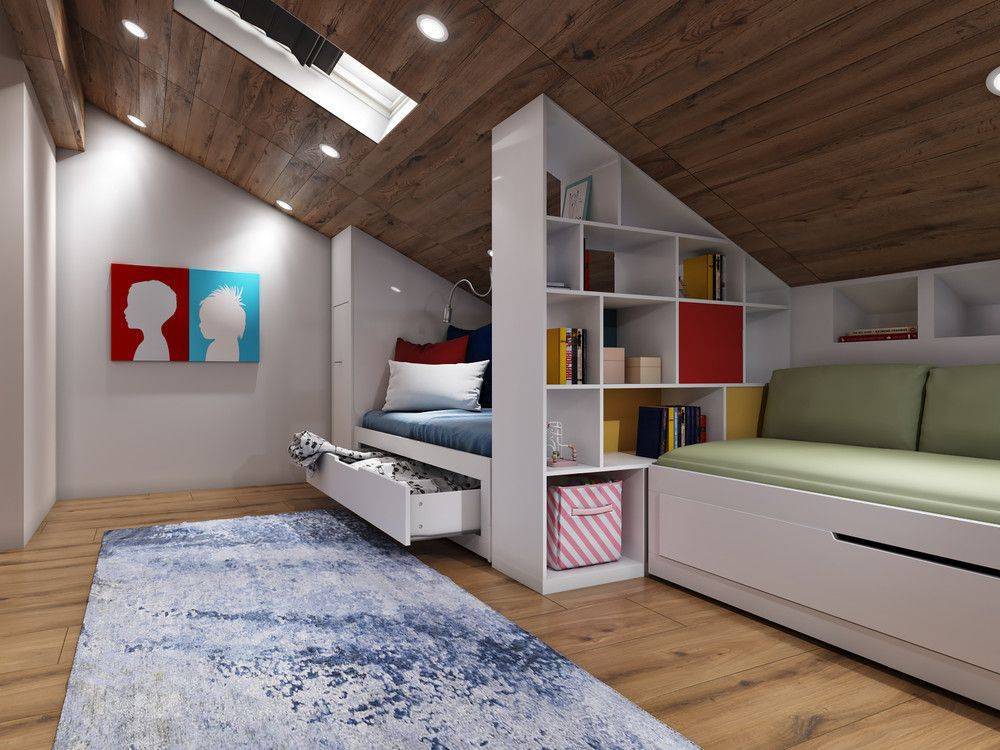 Интерьер комнаты на мансарде для двух детей