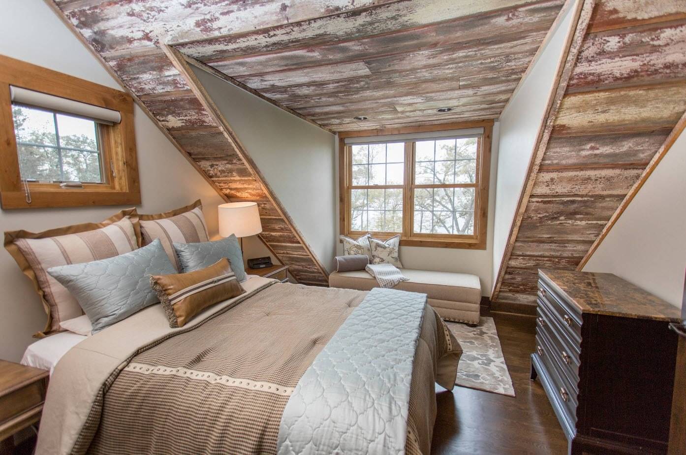 Отделка стен и потолка мансарды деревом позволяет сделать спальню уютной, натуральной и экологичной