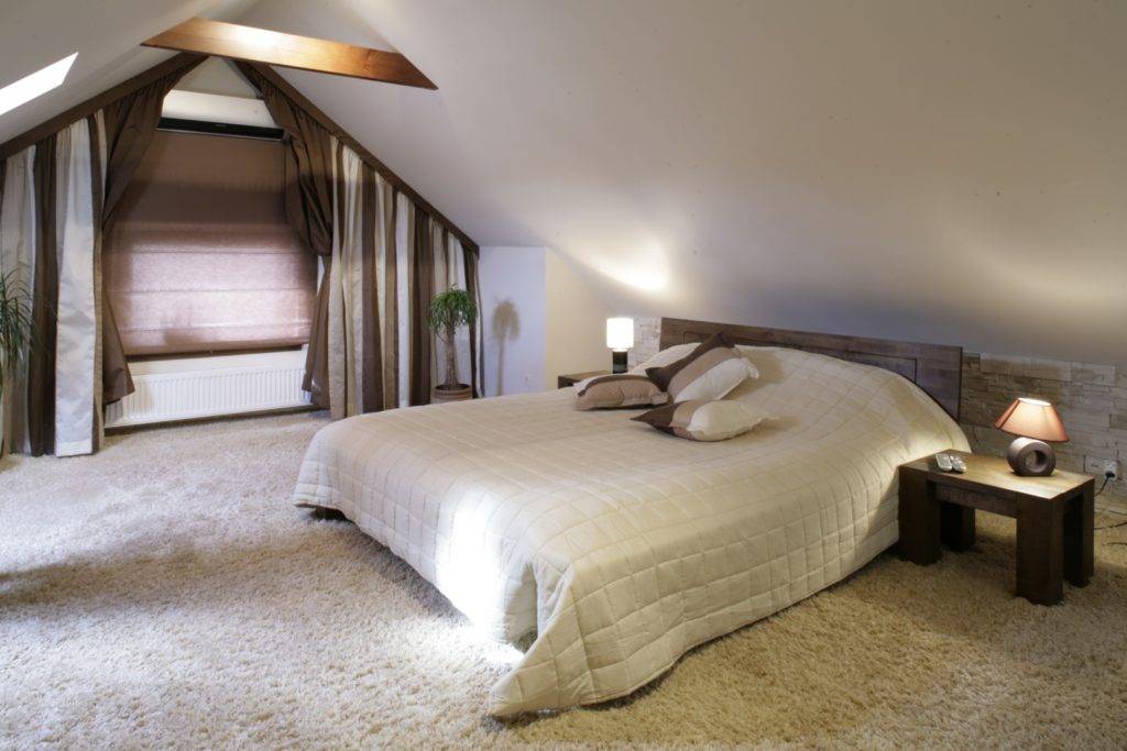Спальное место лучше расположить около фронтальной стены или в центре помещения, где потолки находятся на максимальной высоте. Хотя очень часто встречаются решения, когда кровать или диван ставят под скатами крыши. Дизайнеры советуют, чтобы расстояние от потолка до матраса должны быть не меньше 90 см. При вставании с кровати, вы не будете ударяться головой об твёрдые предметы.