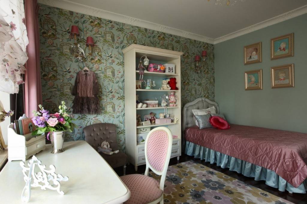 Девичья спальня выполняется преимущественно в розовом, кремовом, фиалковом, персиковом колере. Здесь много драпировок, кружев, вышитых мотивов. Обязательно присутствует туалетный столик. На драпировках и фотообоях изображается лаванда, петушки, морские звезды.