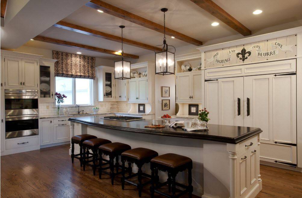 Оформление потолка может быть балочным либо кессонным. И тот и другой вариант отлично оттеняют штукатурку. Кто-то умудряется сделать потолок натяжным, другие предпочитают использовать в работе гипсокартон. Что бы ни было выбрано за основу, потолок должен быть красивым и эстетически привлекательным, но при этом несложным с конструктивной точки зрения. Если он будет перегружен уровнями и сложными изгибами, это нарушит гармонию стиля французской глубинки.