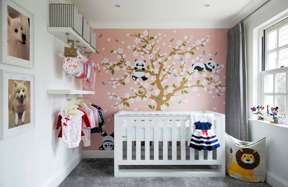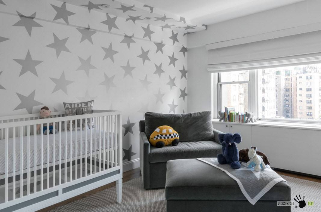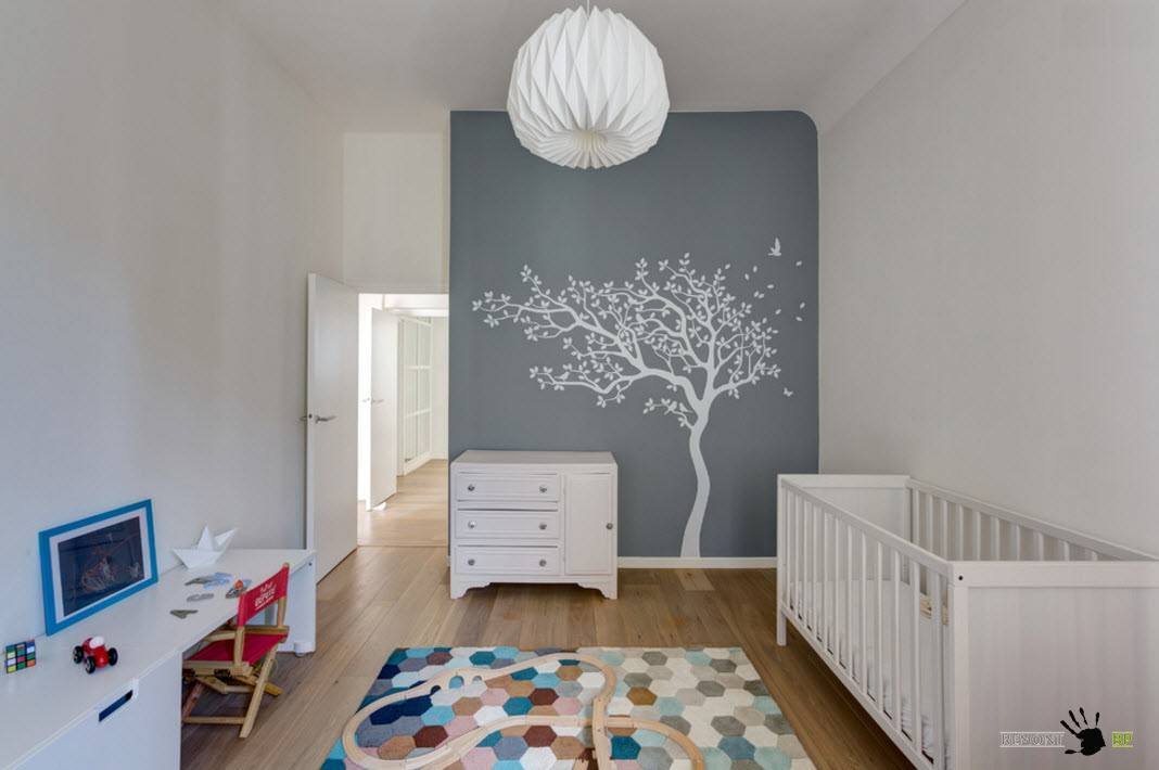 Для отделки стен лучше использовать безопасную покраску или оклеивание обоями. Бумажные обои с виниловой поверхностью не только создадут привлекательный внешний вид комнаты, но и окажутся практичным вариантом отделки стен через некоторое время, когда ребенок начнет ходить, а затем и рисовать на любых поверхностях. Едва ли вы планировали делать ремонт через год или два после рождения ребенка, поэтому отделку стен лучше продумать с запасом практичности и функциональности, соответствующим растущим потребностям вашего чада.