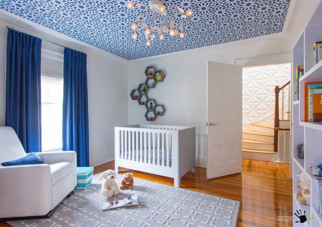 В комнате для малыша лучше отказаться от столь популярных нынче натяжных потолков. Материал, с помощью которого осуществляется отделка, является полностью синтетическим. Лучше отдать предпочтение покраски с помощью безопасных материалов. Правда для этого необходимо добиться идеально ровной поверхности потолка либо с помощью оштукатуривания, или посредством подвесных конструкций.