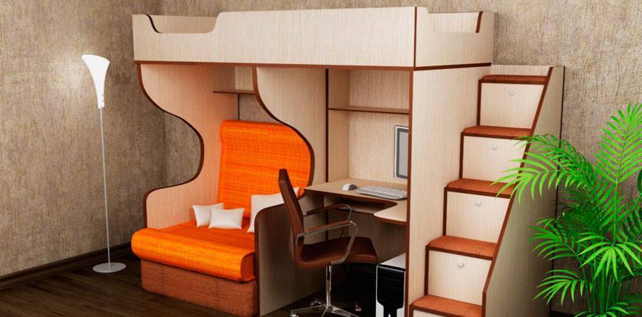 - Трансформер, где два или три спальных места, нижнее из которых перевоплощается в рабочую зону. Система регулировки должна легко работать, но быть устойчивой.
