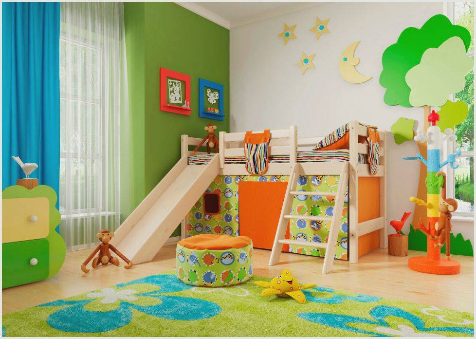 Зеленая кровать в детской комнатеДвухъярусная кровать с горкой для спуска