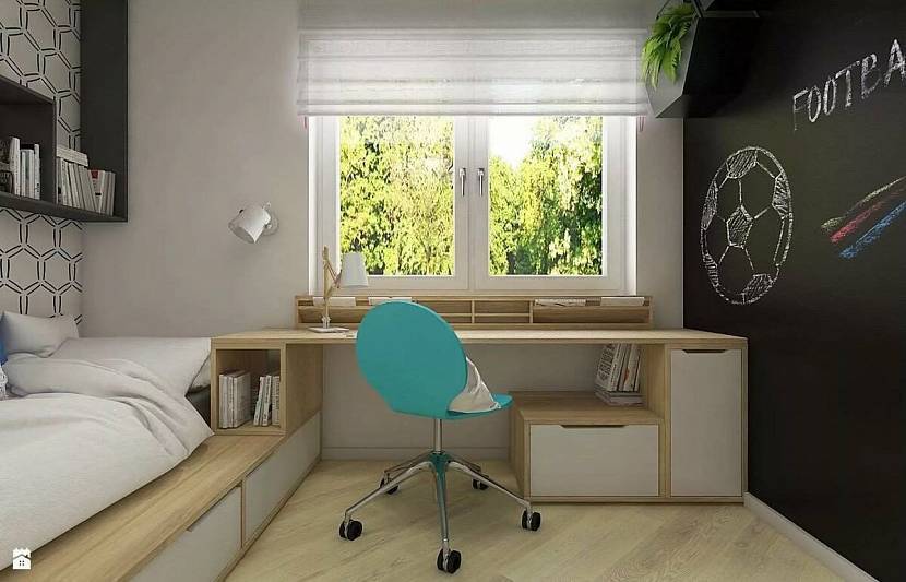 Если позволяет высота, можно убирать подоконник и вместо нее встраивать столешницу, увеличивая тем самым площадь рабочей поверхности. Расположение стола у окна освобождает больше места для игр и отдыха. Что очень актуально для маленьких комнат.