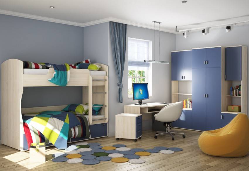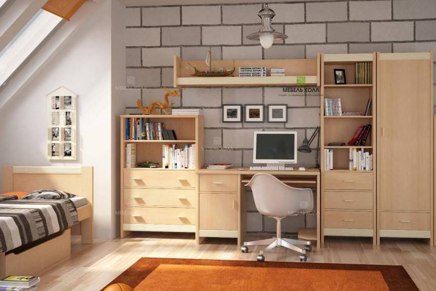 Комната для двоих должна выстраиваться в строго симметричном порядке, оба школьника должны иметь одинаковое пространство, одинаковое количество полок, осветительных приборов.