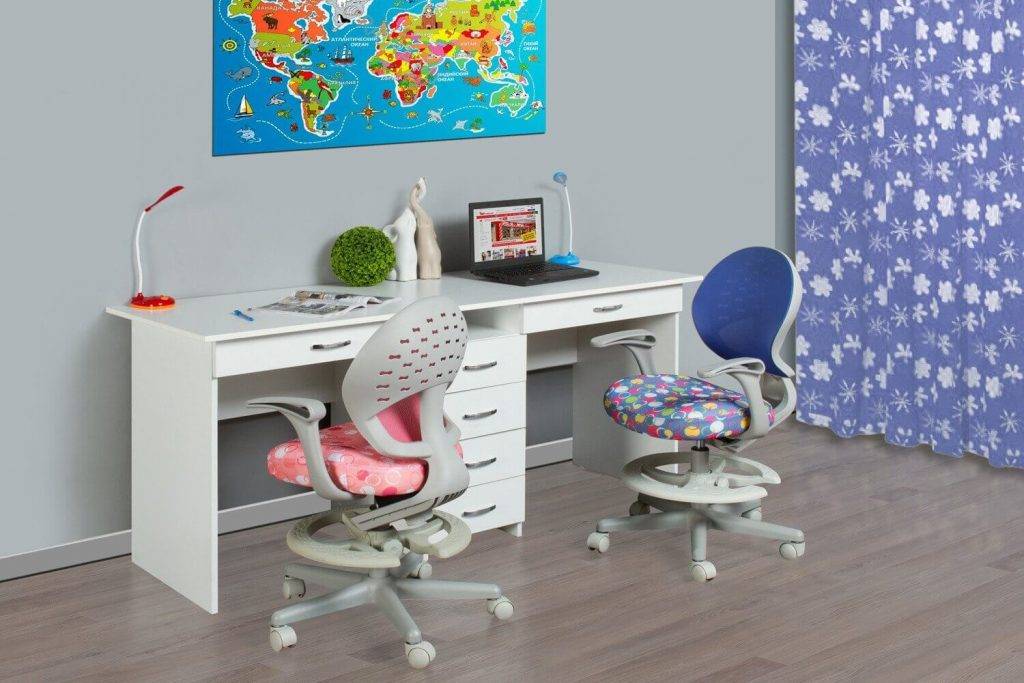 Колени у ребенка должны быть согнуты под углом 90 градусов, ступни — удобно размещаться на полу. Надо выбирать изделие с шириной не менее 80 см, глубиной — 60 см. Если компьютер будет располагаться тут же, то ширина, соответственно, должна составлять не менее 100 см. От столешницы до колен должно быть примерно 10–15 см, до стула — 20–24 см. При невозможности коснуться ступнями пола надо соорудить подставку для ног. Деревянную подставку желательно обтянуть материей. Можно подпилить ножки, но нужно учесть, что маленькие дети растут очень быстро. Сделать выше низкий стол поможет подиум, который одновременно будет служить подставкой для ног. Можно приобрести опоры без столешницы.