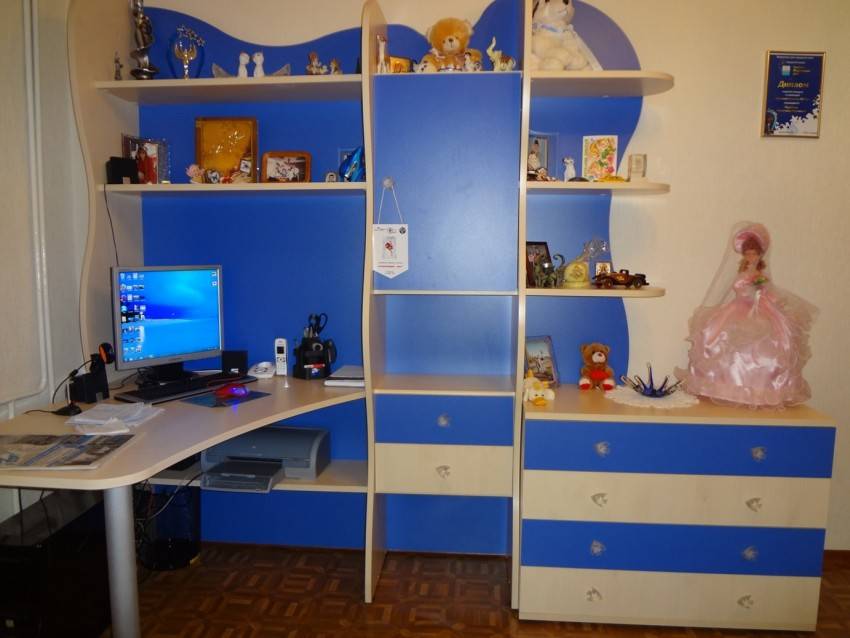 Можно выбрать угловые изделия, а также прямоугольные и в виде буквы Г. Для малогабаритных квартир выбирают угловое расположение стола. Этот вариант не займет много пространства, но поверхность мебели позволит вместить немало предметов. Функциональным стол сделают выдвижные ящики или тумба. Рабочее место ребенка нежелательно совмещать с компьютерным столом. ПК должен располагаться на отдельном столике, хотя не всегда такое возможно.
