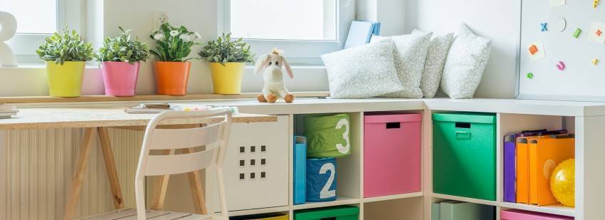 С того момента, как ребенок пойдет в школу, в комнате должны присутствовать прочная столешница и стул, которые помогут сохранить правильную осанку во время учебы и выполнения домашней работы. Полки для книг и школьных принадлежностей должны быть расположены в пределах легкой досягаемости.