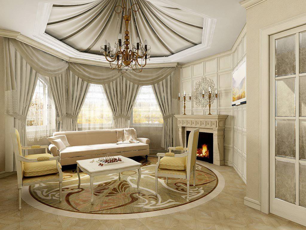 Шторы, подушки, обивка мебели должны соответствовать классическому стилю зала и гармонировать между собой. На окна – красивые шторы из дорогой ткани. Их можно украсить кистями, бахромой или изящными подхватами.