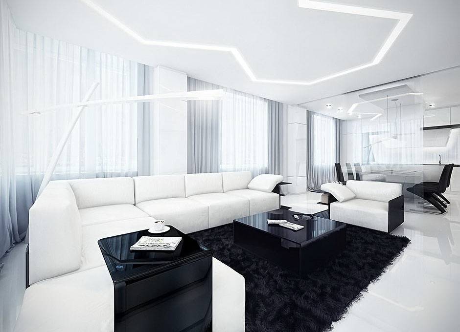 Зона гостиной с мягкой мебелью должна гармонично сочетаться с остальным интерьером. Она может быть выполнена в тон общей отделки помещения или контрастировать с ней. Современная гостиная в модном сегодня стиле хай-тек требует продуманной до мелочей конструкции мебели, максимально функциональной. Диван, а также кресла могут иметь встроенную подсветку или дизайнерский светильник, выдвижные полки и подлокотники. Мебель чаще всего имеет кожаную обивку.