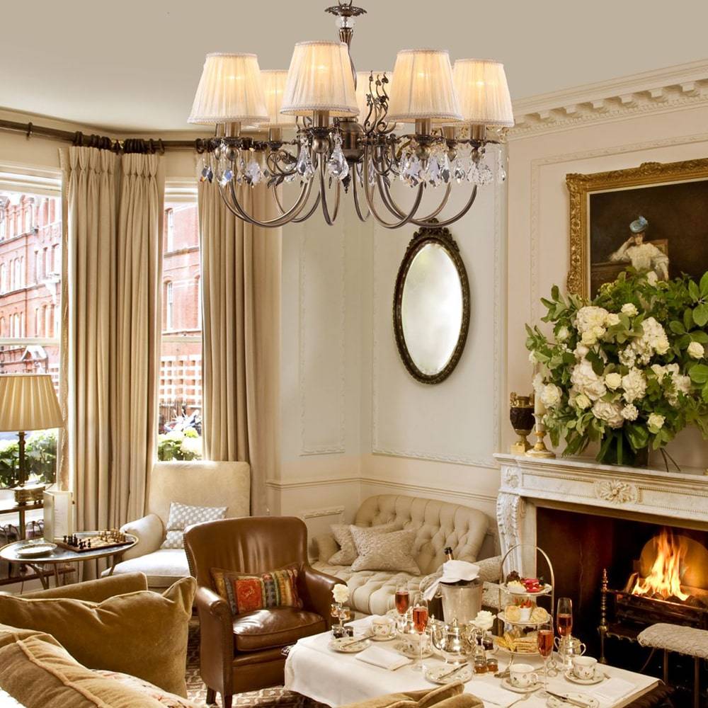 Для оформления в классическом стиле подойдут торшеры, бра, настольные лампы, рожковые люстры. Стоит вспомнить про хрусталь.