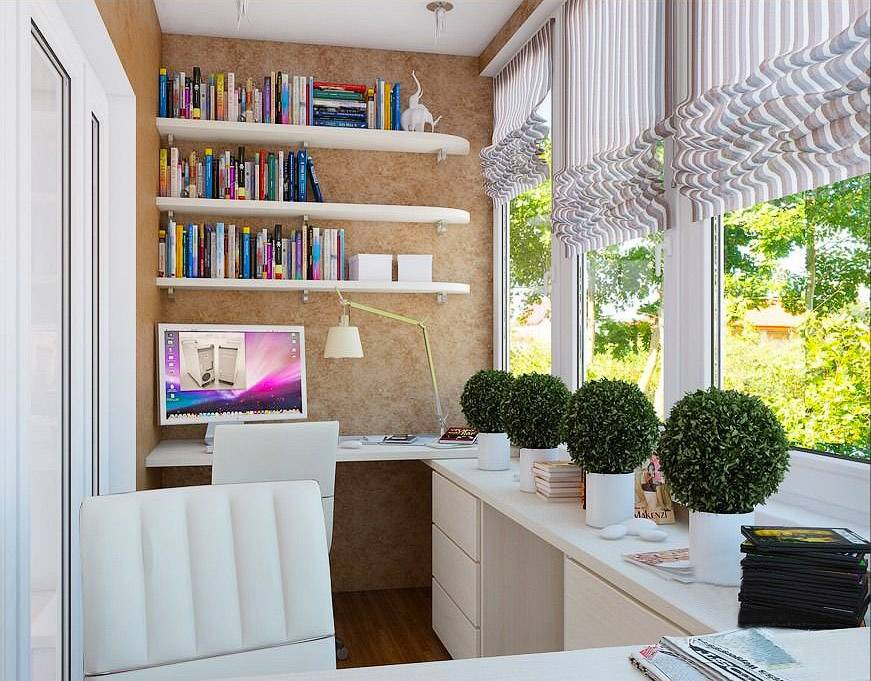 - Для тех, кто работает дома, можно оборудовать рабочий кабинет на месте балкона. Такой вариант станет идеальным и для творческих личностей – художников или швей. В одном месте можно навесить большое количество полочек, где удобно расположить все рабочие материалы. Мастерская на месте бывшего балкона позволит заниматься работой или любимым делом без отрыва от семьи.