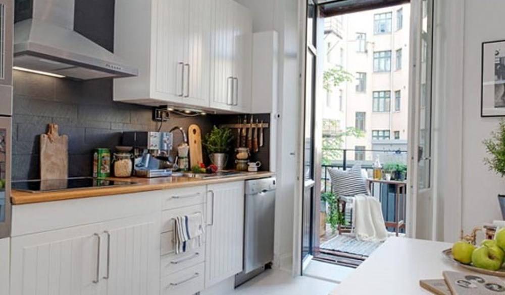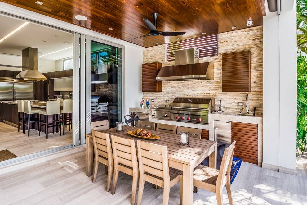 Рабочая зона может быть полностью вынесена на дополнительный метраж. Это избавит дом или квартиру от обилия запахов, которые неизменно сопутствуют процессу приготовления пищи. Также позволит оборудовать полноценную столовую с массивным мебельным гарнитуром. Дизайн балкона с кухней как на фото ниже подходит для мягкого южного климата. Сделать его универсальным помогут утепление и окна.