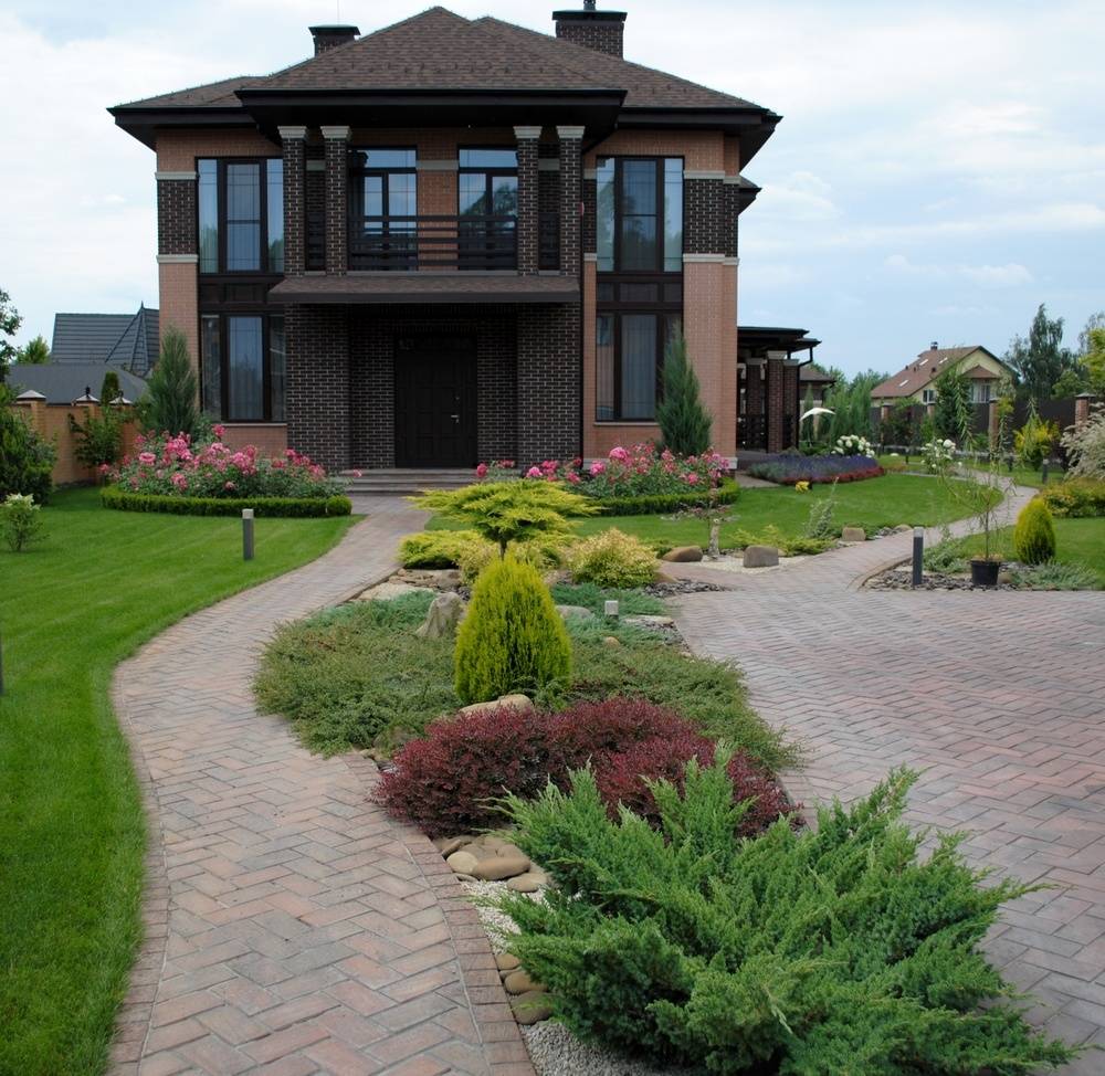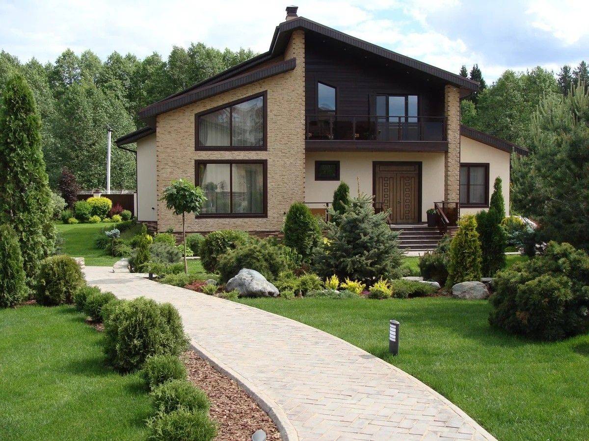 При обустройстве экстерьера двухэтажных домов используют полимерные и натурального происхождения материалы.