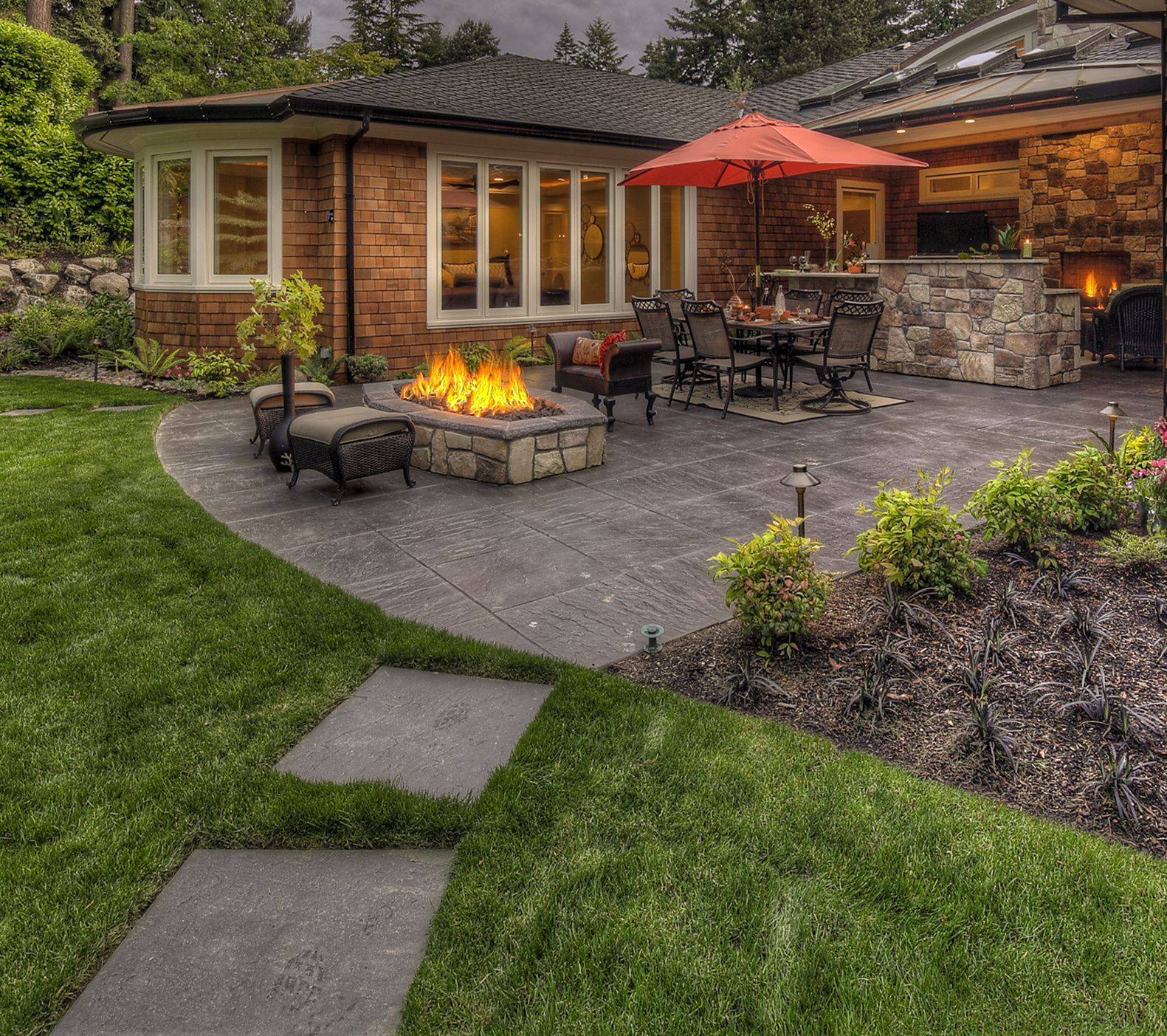 Серый цвет конструкции эффектно оттеняет палитра красок мягких думок. Из того же материала сооружен пьедестал костра на свежем воздухе.
