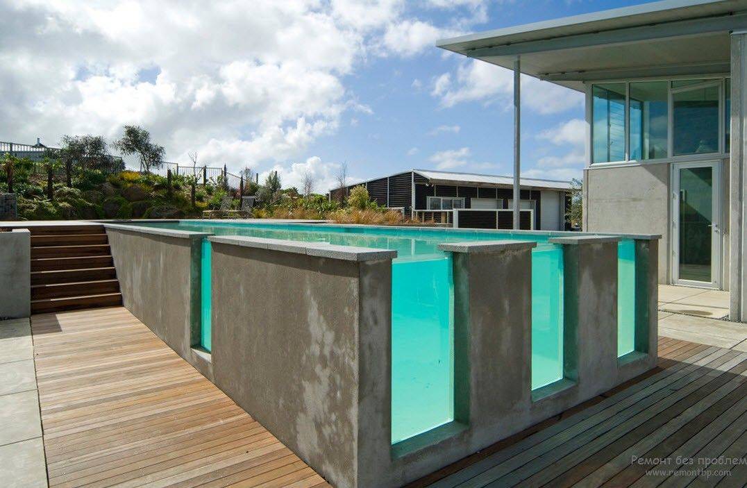 - Стенки и основа чаши с прозрачных материалов. Для этого резервуар помещается на возвышенном фундаменте или подъеме, а стенки чаши представляют собой сверхпрочное стекло. Можно использовать акриловые панели, встроенные в бетонные стены. Делается весь резервуар прозрачный, одна его сторона или всего лишь небольшие вставки, по типу иллюминатора.
