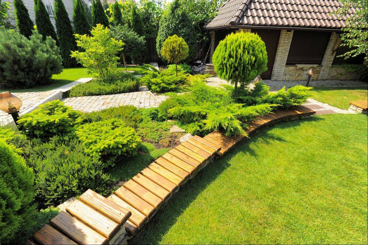 От дома, беседки или каких-либо зон отдыха можно проложить дорожку, выложенную, к примеру, галькой, спилов дерева, плиткой. И вдоль расположить небольшие кустики, цветы, или вазоны с растительностью.