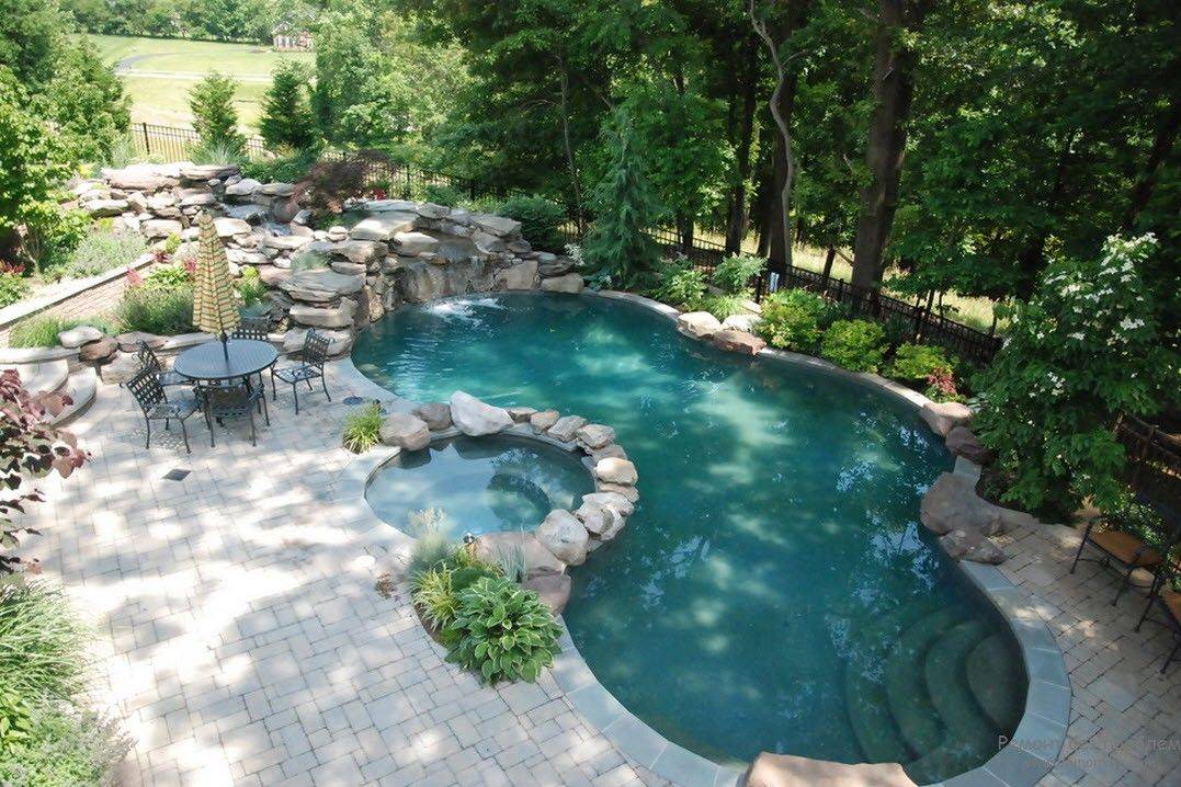 - Бассейны, впадающие друг в друга. На большом участке можно на разных уровнях разместить резервуары, сделав так, чтобы они вода сливалась из верхнего в нижний.