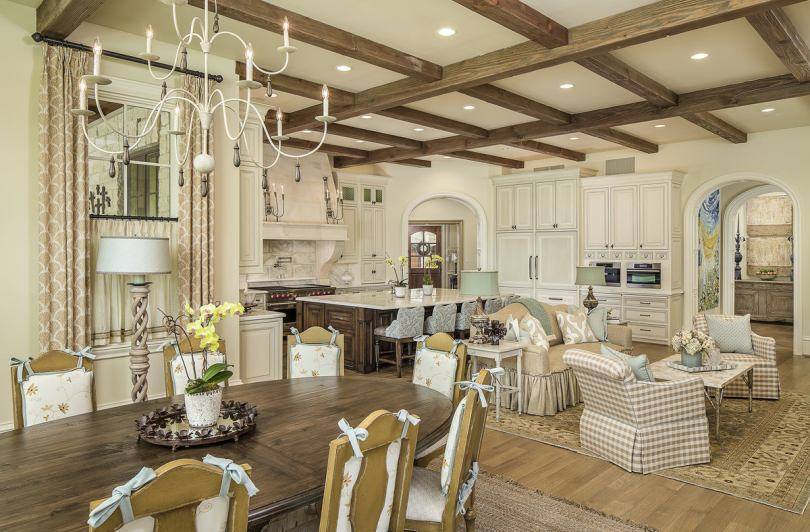 Главным атрибутом стиля является камин. Одно из наиболее удачных мест его расположения – угол, образующий стык гостиной и столовой. Это позволит наблюдать за огнем в камине с обеих сторон.