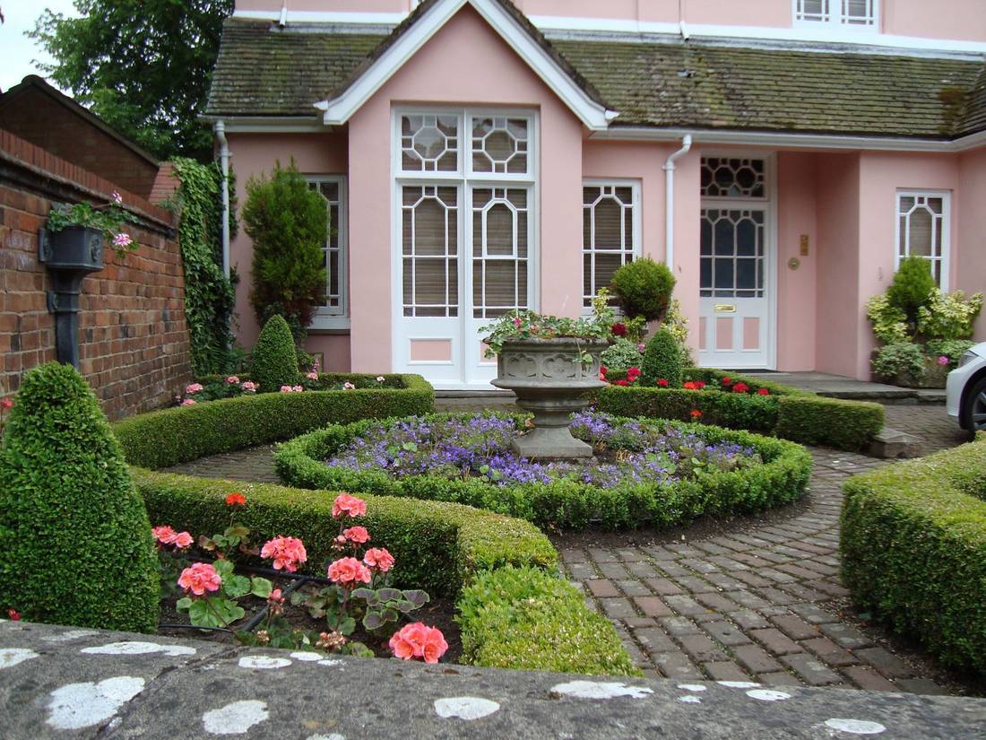 Как известно, классика характеризуется четкой геометрической планировкой. То есть все должно быть расположено симметрично, а газоны, клумбы или водоемы обязательно должны иметь четкие формы. Оттенки для беседки или других деталей лучше выбирать нейтральные, пастельные.