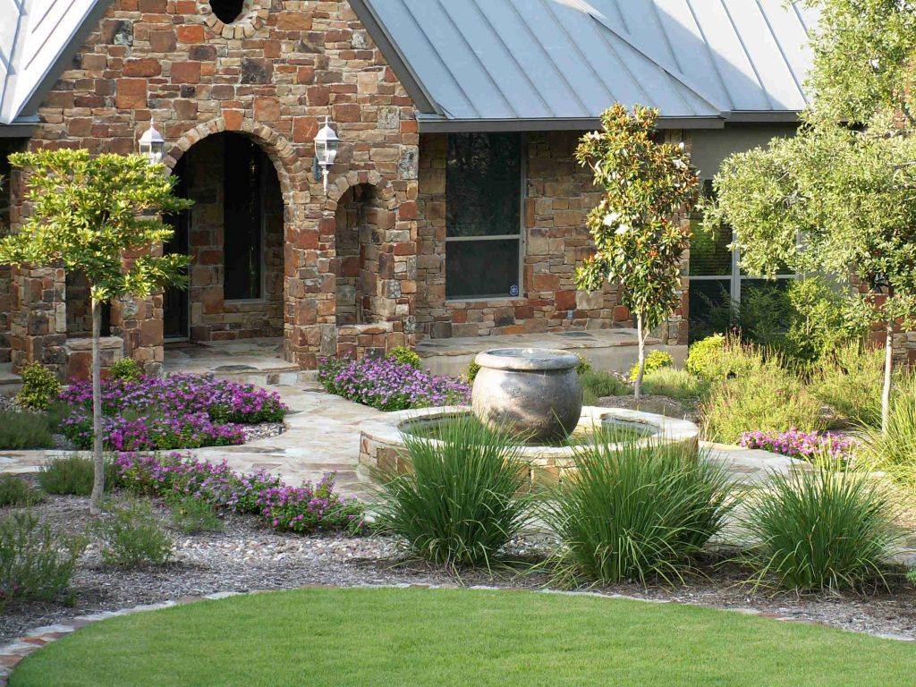 - Фонтан в центре. Здесь есть сразу 2 преимущества. Это будет смотреться изысканно. Кроме того, если туда встроить подсветку, то вечером это будет необычайное зрелище. Фонтаны бывают совершенно разных форм.