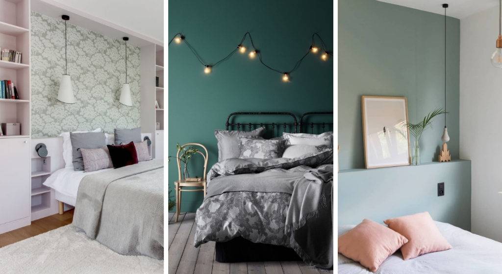 В небольшой комнате роль тумбочек могут играть навесные полки, однако над изголовьем их следует размещать с осторожностью
