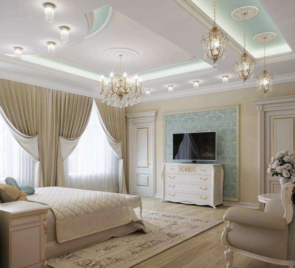 Потолок, как и стены, в классической спальне редко бывает ровным. На нём также присутствует лепнина, характерная для античных времён.