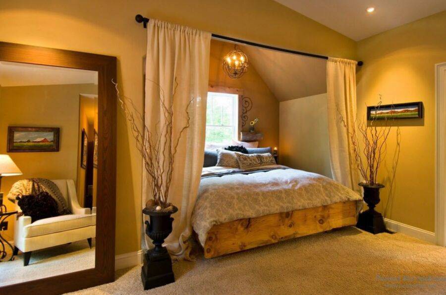 Мебель, отделочные материалы и шторы подчеркивают стилистическое решение. Если это классическая спальня, отдают предпочтение бархату, древесине и обивке из натуральной кожи. Для современного интерьера подойдет пластик, стекло, зеркала и много хромированной фурнитуры.