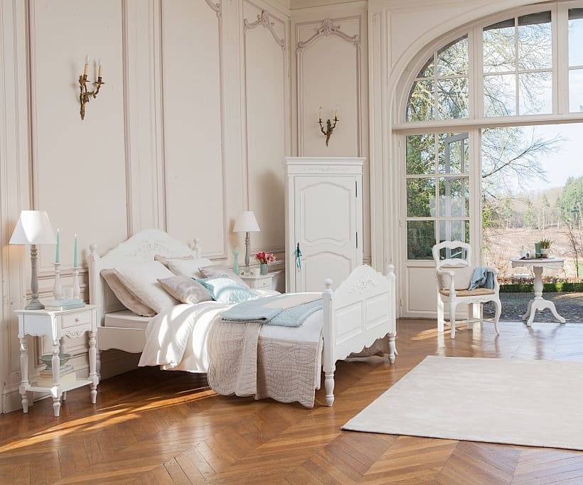 Прованс предполагает дизайн спальни в белом цвете. Покрытие выбирается одного тона, подойдёт рисунок из однотонных мотивов. Панели из дерева выделят фрагмент стены. Эффект состаривания (трещины, потёртости) характерен для интерьера спальни в стиле Прованс. Подойдёт комод, выполненный в старинном стиле. Ткани штор, как правило, натуральные.