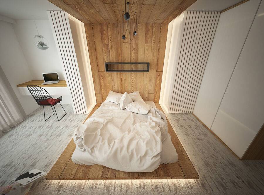 Центральный атрибут каждой спальни. Для того чтобы визуально расширить пространство, можно выбрать модель на небольшом подиуме без ножек. Такой прием поможет сделать кровать практически незаметной в окружающей обстановке и оставить больше воздуха над спальным местом.