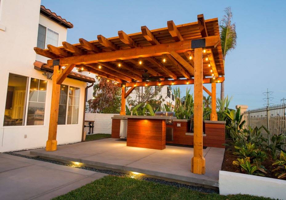 - Средиземноморский стиль. Древесину для открытой беседки выбирают с мягким оттенком. Направлению соответствуют перголы с навесом, под которыми расположен кирпичный очаг.