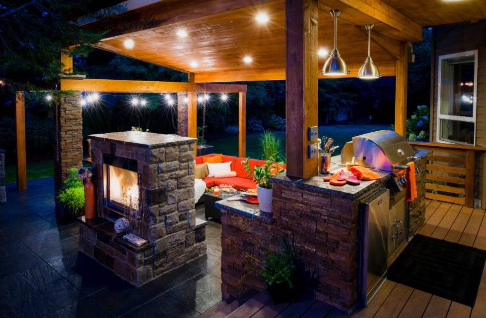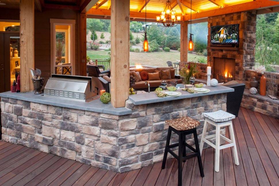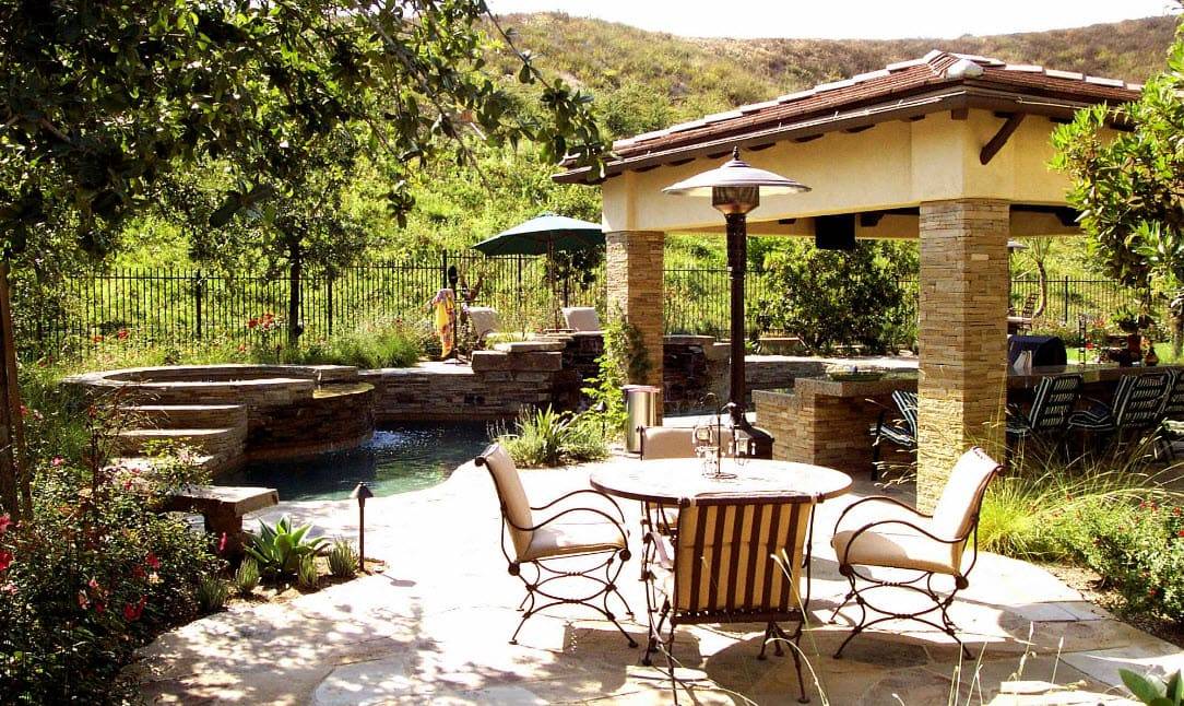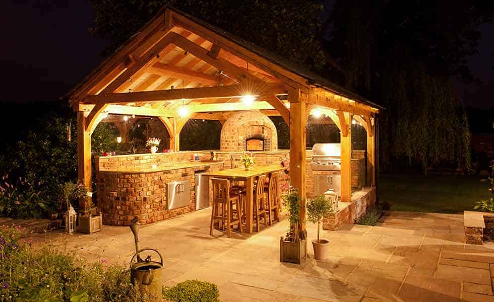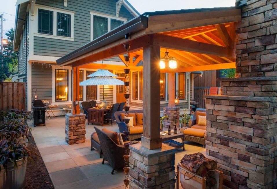 - Кирпич или камень. Такая монументальная беседка возводится на десятки лет. Ее часто снабжают барбекю или мангалом, в оформлении присутствует массивная мебель. Для кирпичных стен придется использовать надежный монолитный или ленточный фундамент. В летнее время ею заменяют уличную кухню для консервирования. В беседке можно разместить запозднившихся друзей и использовать ее в качестве гостевого домика.
