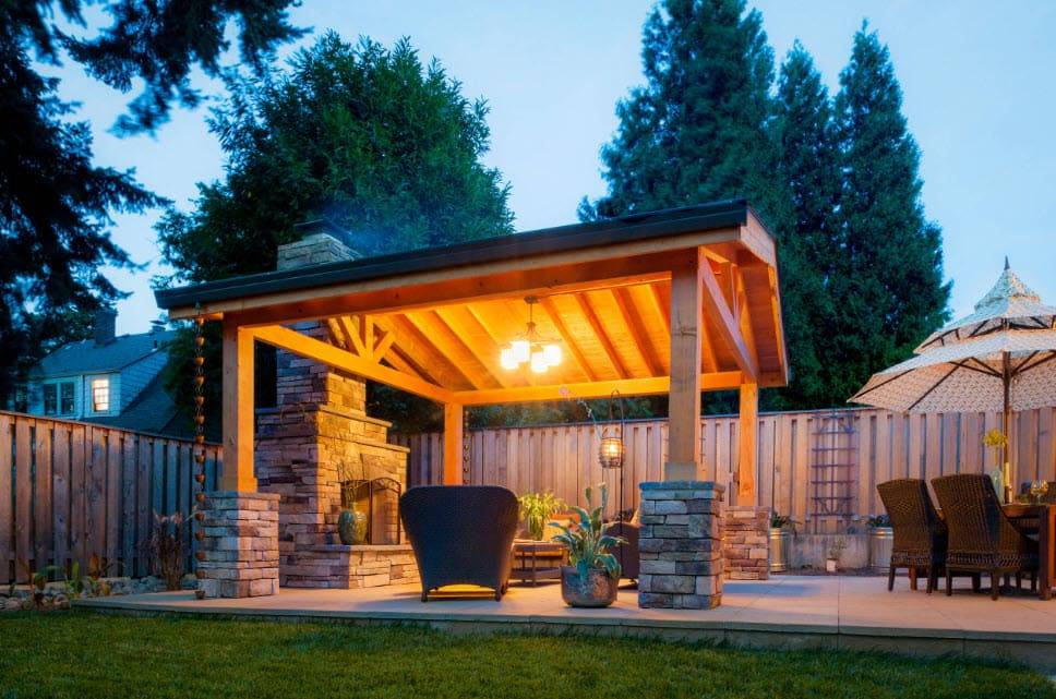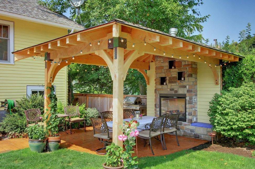 Деревянные беседки с очагом приветствуют дополнительный монолитный фундамент в виде плиты, который служит несущей основой непосредственно для печи. Сам очаг должен быть окружен защитным экраном. А если печь кирпичная, то ее надо возводить еще до каркаса или стен.