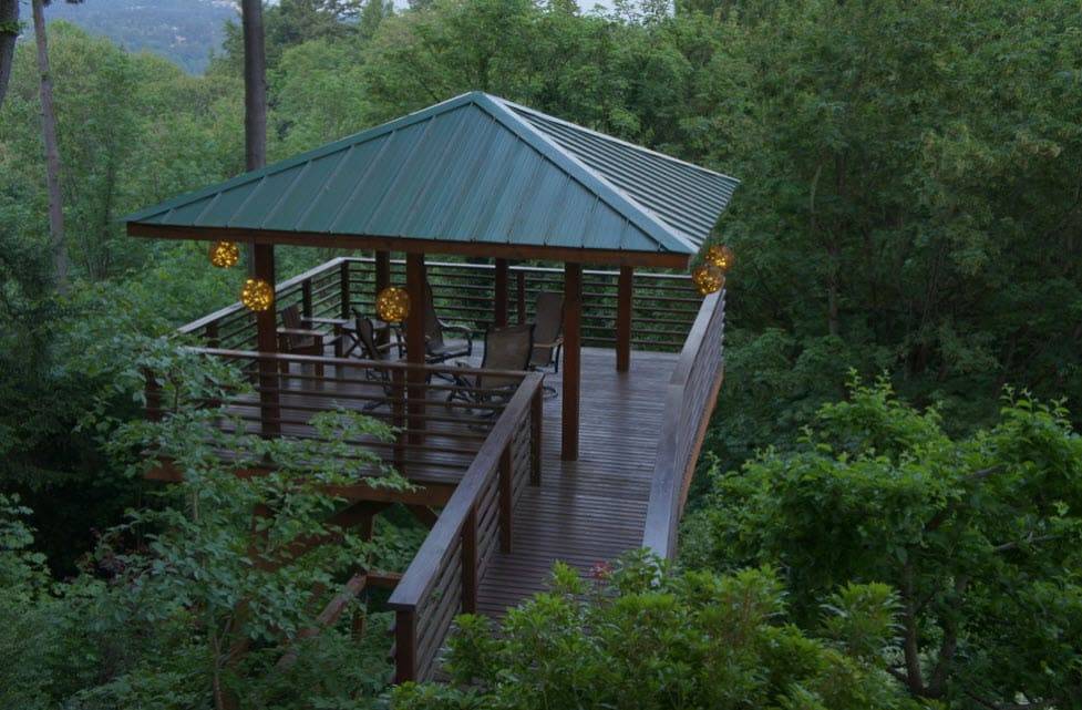 - Лесной. На первый взгляд, строение имеет грубое оформление, украшается разными корягами, выстраивается вокруг старого дерева. Приветствуется резьба. Стулья могут быть сделаны из бревен и пней.