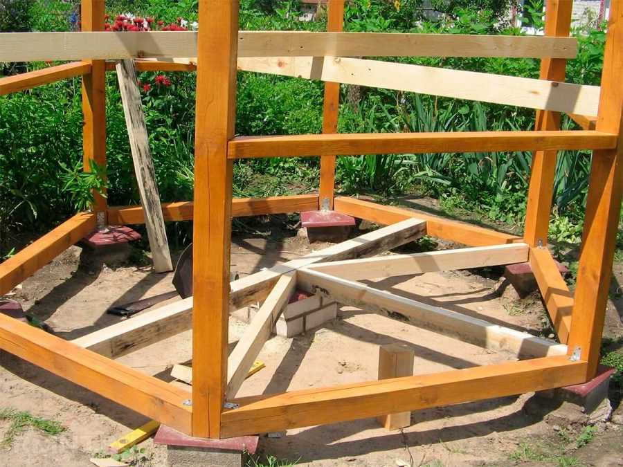 Особое внимание при строительстве беседки следует уделять фундаменту и полу. От того насколько качественно они выполнены, зависит устойчивость конструкции, ее долговечность и даже безопасность тех, кто находится внутри
