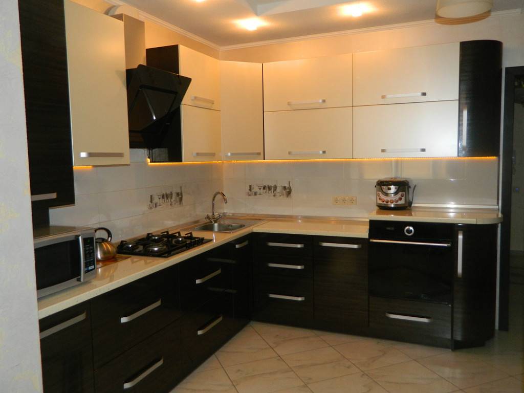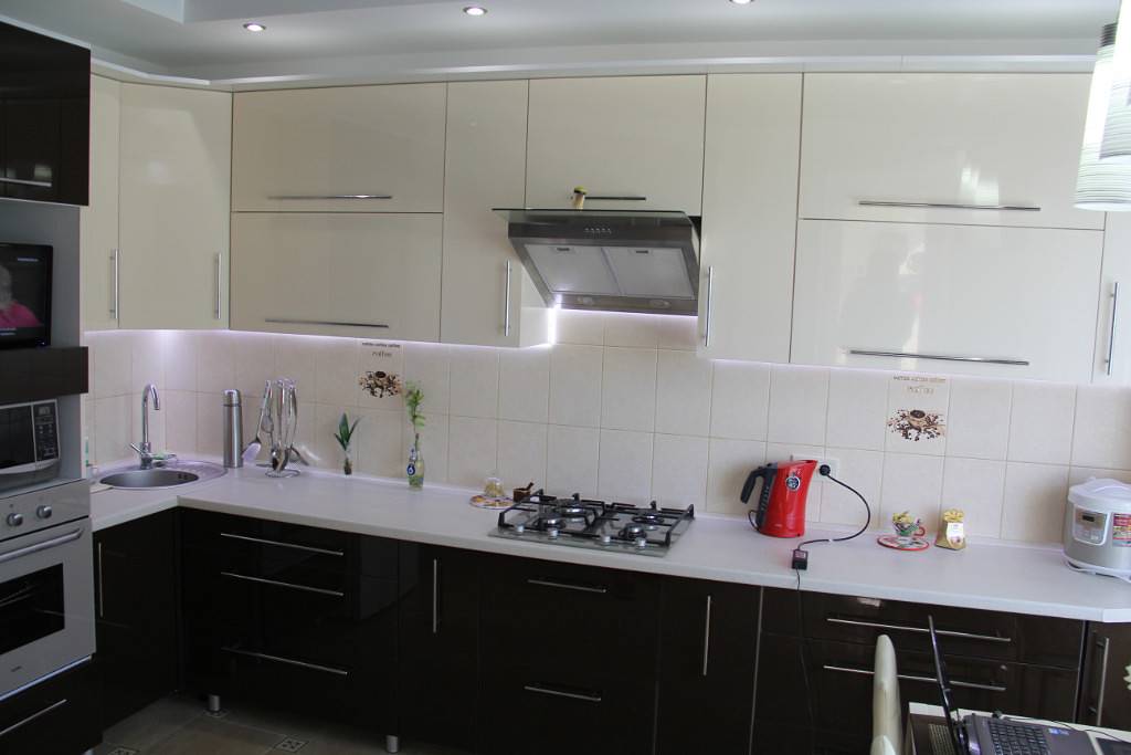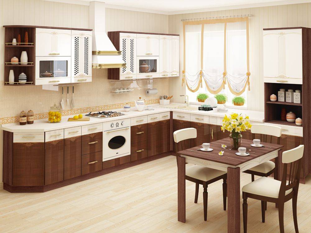 Г-Образная наиболее распространенный способ размещение рабочей зоны, так как актуален для помещений любых размеров. Именно такое решение, одинаково успешно используют при оформлении красивых маленьких кухонь и просторных кухонь-гостиных