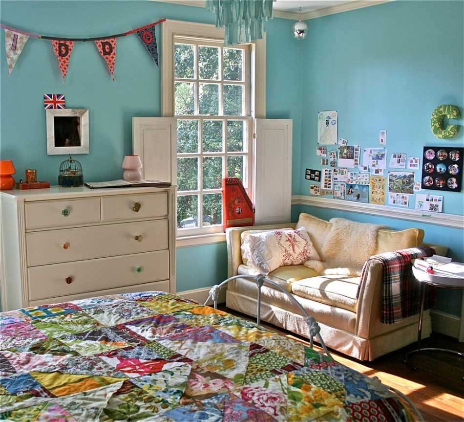 Обратите внимание на другие детали: витражное окошко, модная сине-зеленая гамма в цветах мебели. По возможности не стоит ставить в девичью комнату компьютеры и телевизор, маленьким детям это ни к чему
