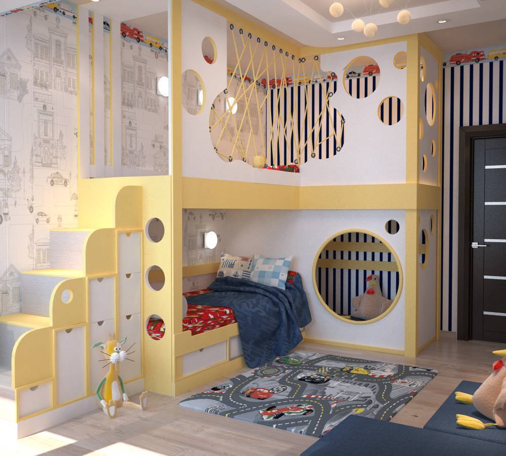В детской 14 кв. м. для двоих можно добавить небольшую горку, которая позволит малышам спускаться с верхнего яруса кровати.